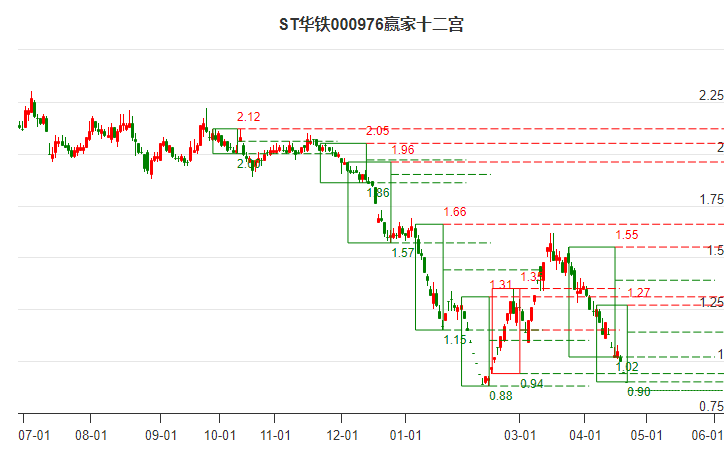 依據(jù)贏家江恩系統(tǒng)趨勢工具極反通道分析判斷ST華鐵000976運行在生命線以下弱勢區(qū)域,根據(jù)規(guī)則該股短線輕倉參與,股價跌至弱勢外軌線后波段再結(jié)合其它工具信號建倉。應(yīng)用口訣是:生命線上強勢走,生命線下難抬頭;紅黃兩條外軌線,壓力支撐顯勢頭。