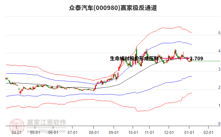 依據(jù)贏家江恩系統(tǒng)趨勢工具極反通道分析判斷眾泰汽車000980運行在生命線以下弱勢區(qū)域,根據(jù)規(guī)則該股短線輕倉參與,股價跌至弱勢外軌線后波段再結合其它工具信號建倉。應用口訣是:生命線上強勢走,生命線下難抬頭;紅黃兩條外軌線,壓力支撐顯勢頭。