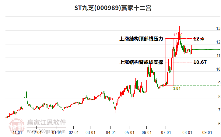 依據(jù)贏家江恩系統(tǒng)趨勢工具極反通道分析判斷ST九芝000989運行在生命線以上強(qiáng)勢區(qū)域,根據(jù)規(guī)則該股可短線、波段結(jié)合操作;結(jié)合物極必反的原理通過分鐘圖做盤中差價,應(yīng)用口訣是:生命線上強(qiáng)勢走,生命線下難抬頭;紅黃兩條外軌線,壓力支撐顯勢頭。