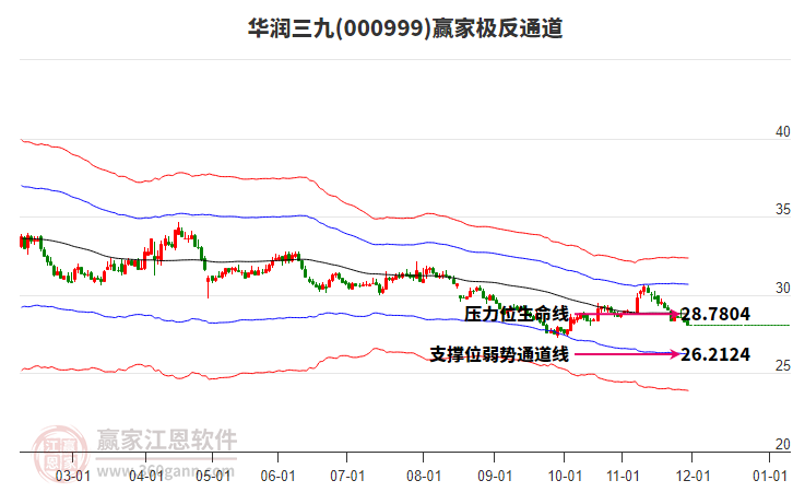 依據(jù)贏家江恩系統(tǒng)趨勢工具極反通道分析判斷華潤三九000999運(yùn)行在生命線以下弱勢區(qū)域,根據(jù)規(guī)則該股短線輕倉參與,股價(jià)跌至弱勢外軌線后波段再結(jié)合其它工具信號建倉。應(yīng)用口訣是:生命線上強(qiáng)勢走,生命線下難抬頭;紅黃兩條外軌線,壓力支撐顯勢頭。