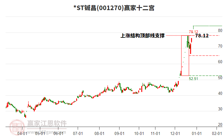 001270*ST鋮昌目前漲停,走出獨(dú)立行情。001270*ST鋮昌處于贏家江恩多頭主線形態(tài),今日重心上移,短期持續(xù)上漲,長期發(fā)出江恩筑底信號,屬長期多頭預(yù)警。*ST鋮昌今日跳空高開,截止目前K線漲停