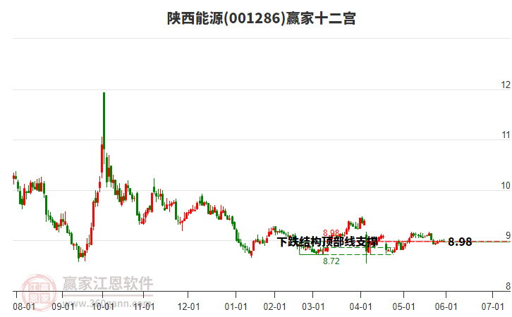 依據(jù)贏家江恩系統(tǒng)趨勢(shì)工具極反通道分析判斷陜西能源001286運(yùn)行在生命線以下弱勢(shì)區(qū)域,根據(jù)規(guī)則該股短線輕倉(cāng)參與,股價(jià)跌至弱勢(shì)外軌線后波段再結(jié)合其它工具信號(hào)建倉(cāng)。應(yīng)用口訣是:生命線上強(qiáng)勢(shì)走,生命線下難抬頭;紅黃兩條外軌線,壓力支撐顯勢(shì)頭。
