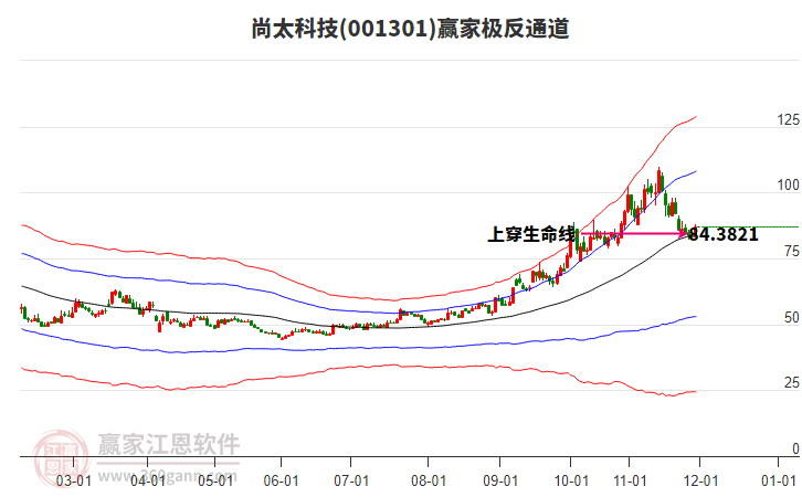 依據(jù)贏家江恩系統(tǒng)趨勢工具極反通道分析判斷尚太科技001301運(yùn)行在生命線以下弱勢區(qū)域,根據(jù)規(guī)則該股短線輕倉參與,股價(jià)跌至弱勢外軌線后波段再結(jié)合其它工具信號(hào)建倉。應(yīng)用口訣是:生命線上強(qiáng)勢走,生命線下難抬頭;紅黃兩條外軌線,壓力支撐顯勢頭。
