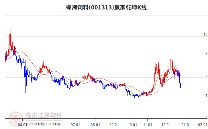 粵海飼料(001313)處于贏家江恩多頭主線形態(tài),12月22日發(fā)出江恩筑頂信號后,經(jīng)過23日,今日再次發(fā)出江恩底分型并發(fā)出江恩筑底信號,中期雖然處于回調中,但長期多頭趨勢延續(xù)?;浐o暳辖袢仗崭唛_后截