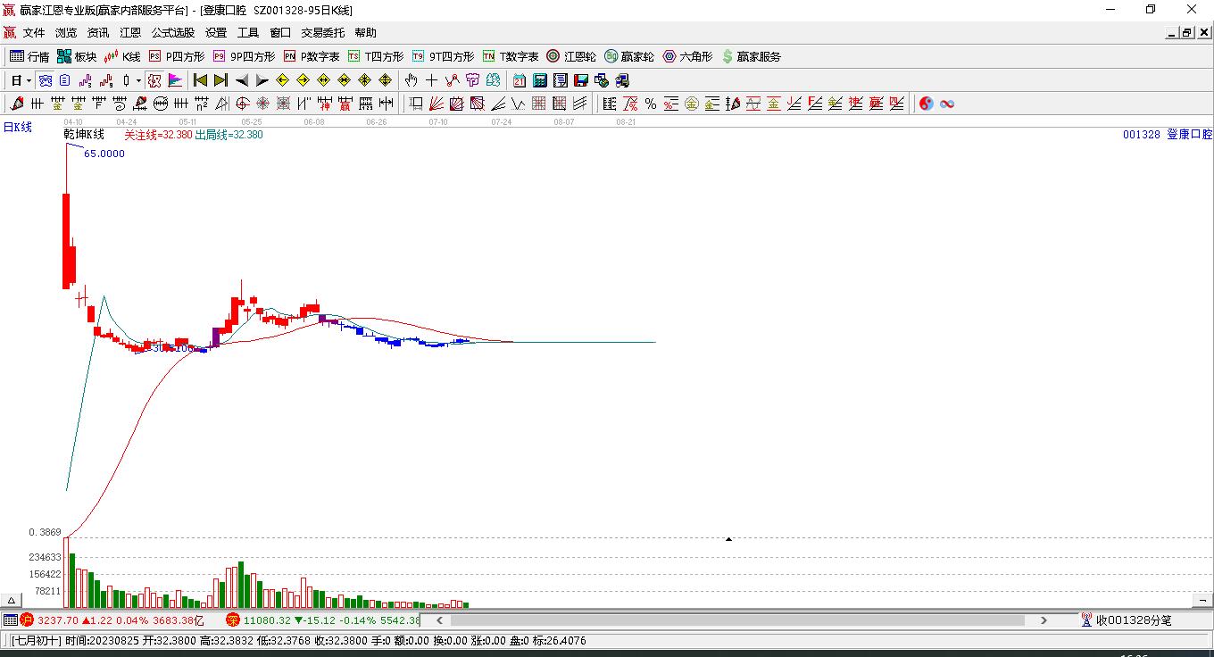 目前登康口腔001328上穿藍(lán)色外軌線 以穿頭破腳中陽線收盤