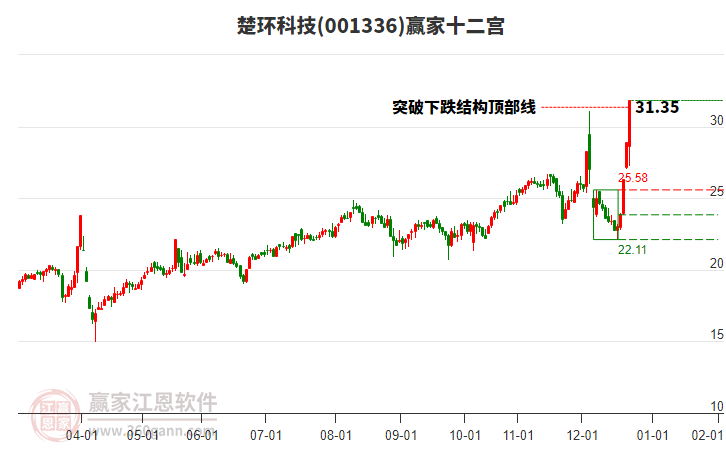 001336楚環(huán)科技處于贏家江恩多頭主線形態(tài),從12月17日形成底分型后持續(xù)上攻,今日突破前高形成初次江恩筑底信號,中長期多頭趨勢依舊保持。001336楚環(huán)科技目前大幅上漲6.18%,所屬板塊工業(yè)機械