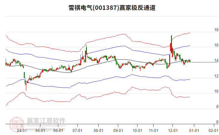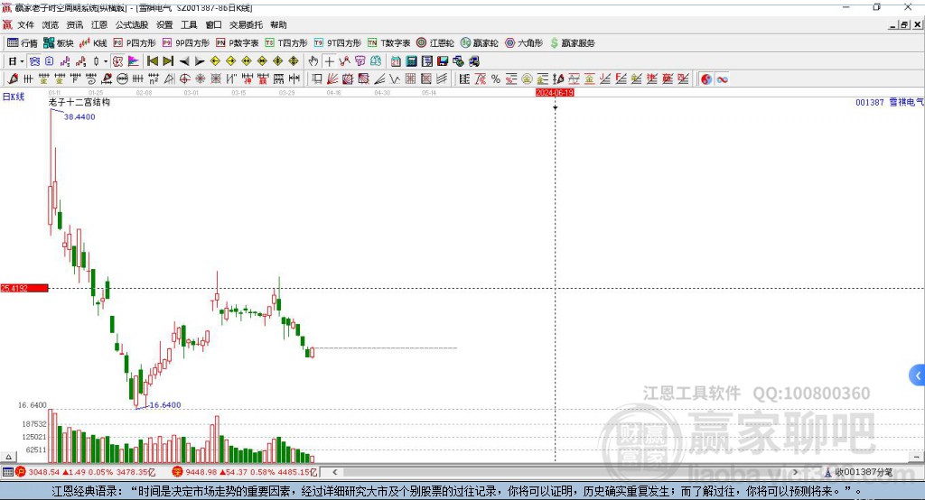依據(jù)贏家江恩系統(tǒng)趨勢(shì)工具極反通道分析判斷雪祺電氣001387運(yùn)行在生命線以下弱勢(shì)區(qū)域,根據(jù)規(guī)則該股短線輕倉(cāng)參與,股價(jià)跌至弱勢(shì)外軌線后波段再結(jié)合其它工具信號(hào)建倉(cāng)。應(yīng)用口訣是:生命線上強(qiáng)勢(shì)走,生命線下難抬頭;紅黃兩條外軌線,壓力支撐顯勢(shì)頭。