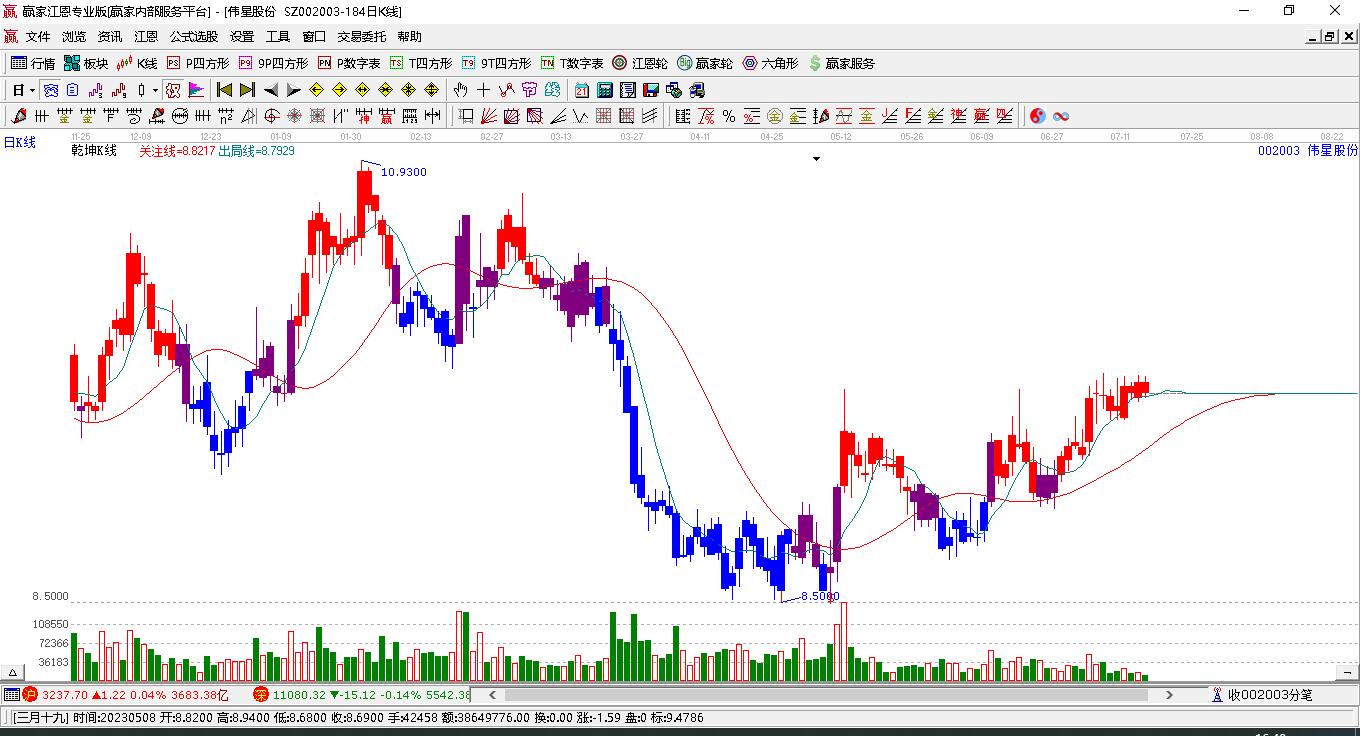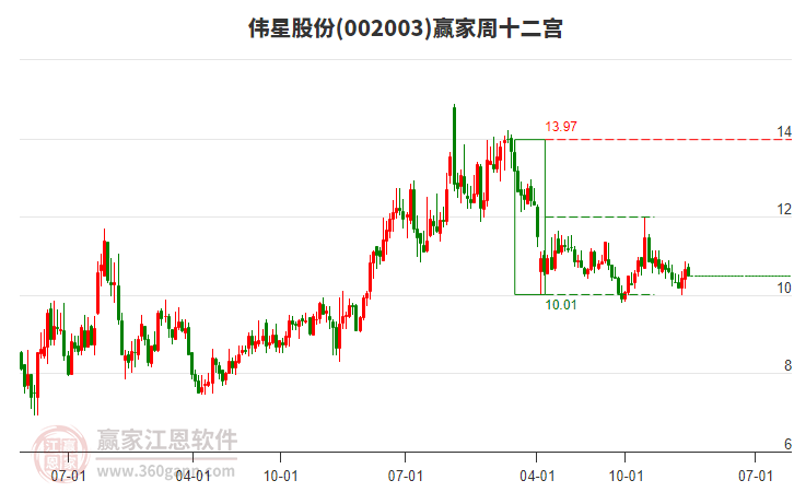 002003偉星股份處于贏家江恩多頭主線形態(tài),從12月24日形成底分型后持續(xù)上攻,今日突破前高形成初次江恩筑底信號,中期雖然處于回調中,但長期多頭趨勢延續(xù)。002003偉星股份根據(jù)贏家江恩極反通道趨勢