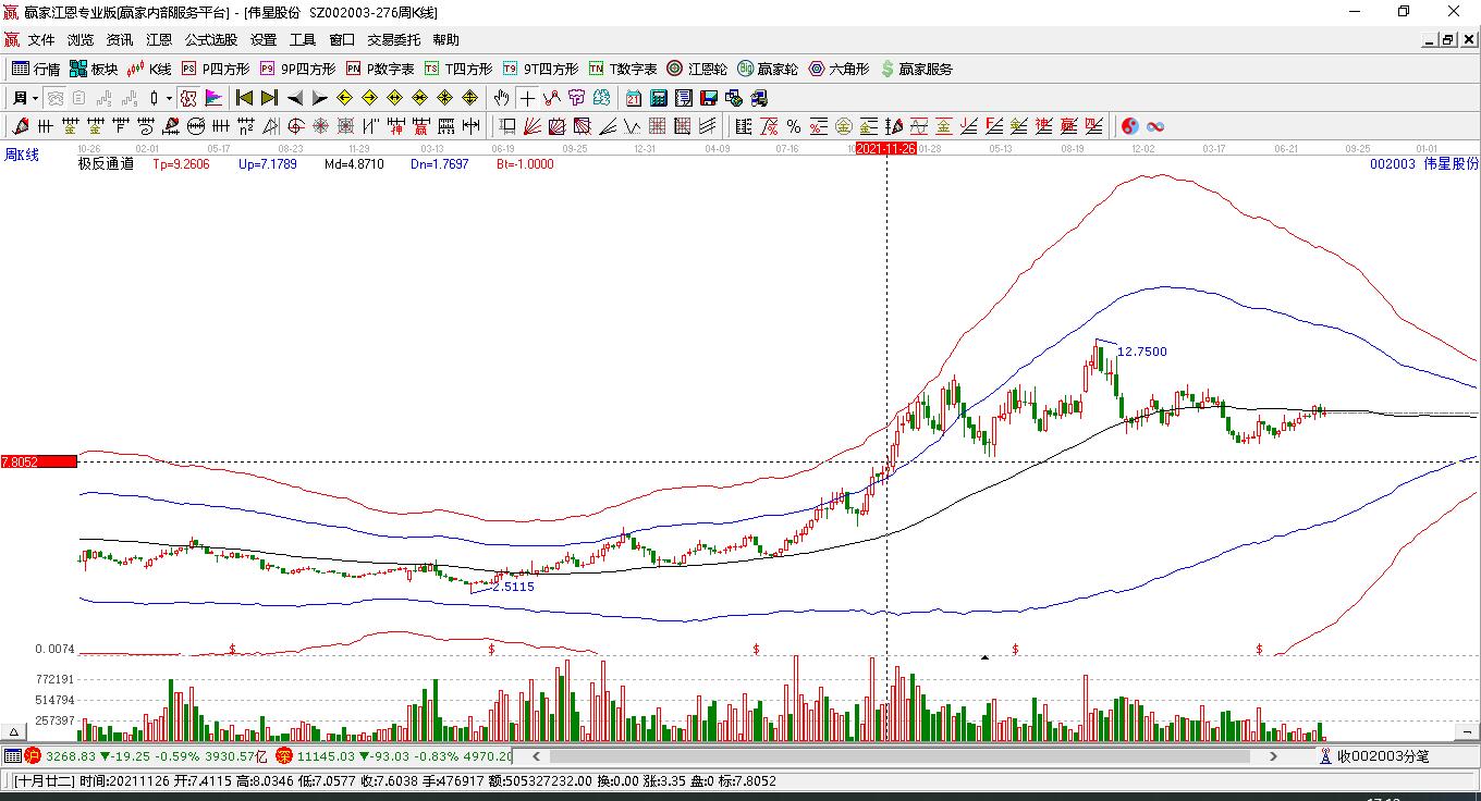 002003偉星股份處于贏家江恩多頭主線形態(tài),12月8日發(fā)出江恩筑頂信號后,經(jīng)過2日,今日再次發(fā)出江恩底分型并發(fā)出江恩筑底信號,中長期多頭趨勢依舊保持。002003偉星股份根據(jù)贏家江恩極反通道趨勢工具