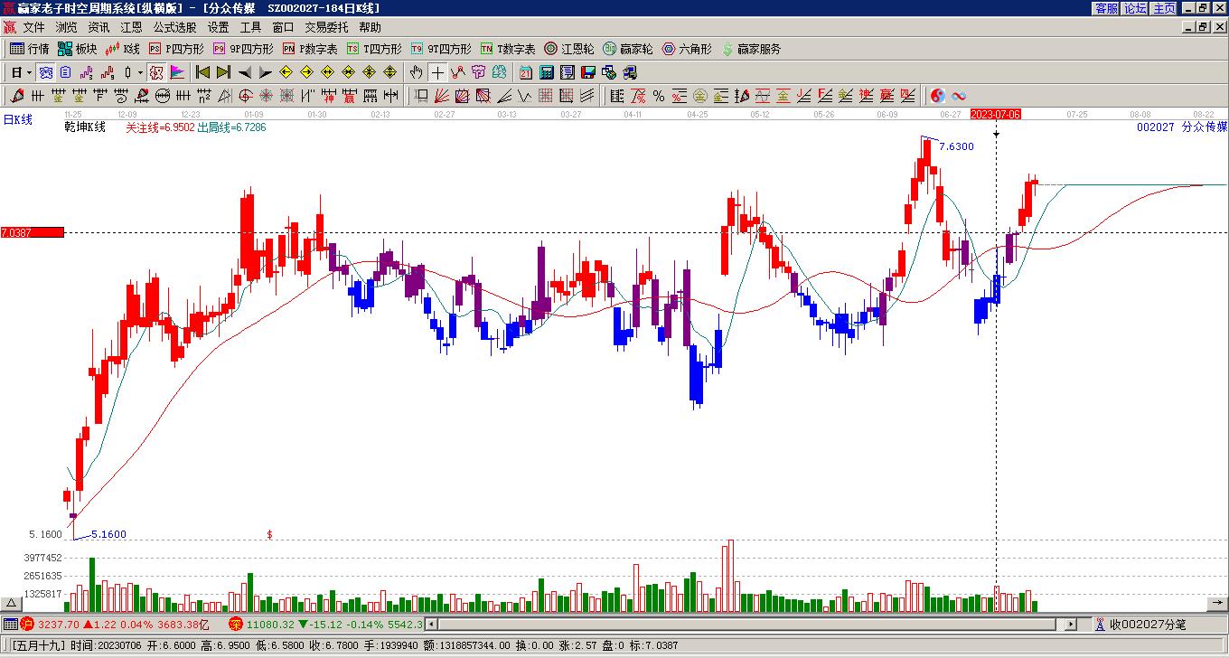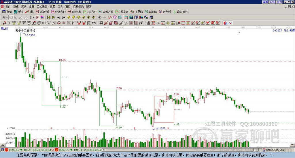 002027分眾傳媒處于贏家江恩多頭次主線形態(tài),12月29日發(fā)出江恩筑底信號后,經(jīng)過28日,今日形成短期筑頂信號,短期多頭趨勢已被破壞,中長期目前都處于回調(diào)中。002027分眾傳媒根據(jù)贏家江恩極反通道