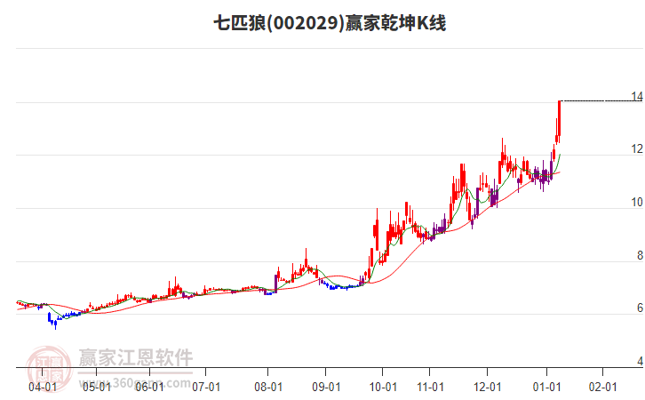 七匹狼002029當(dāng)天漲停,今日突破藍(lán)色上軌線