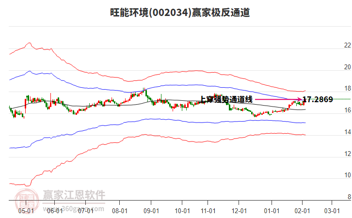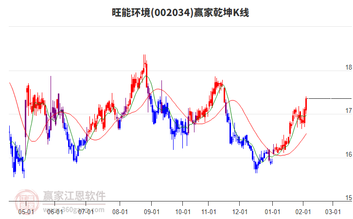 當天旺能環(huán)境002034最高價17.42上穿了贏家極反通道工具藍色外軌線,受到藍色外軌線強力壓制,最終收盤停留在在藍色外軌線與生命線上方的強勢通道區(qū)域。旺能環(huán)境002034近10個交易日漲幅2.19%