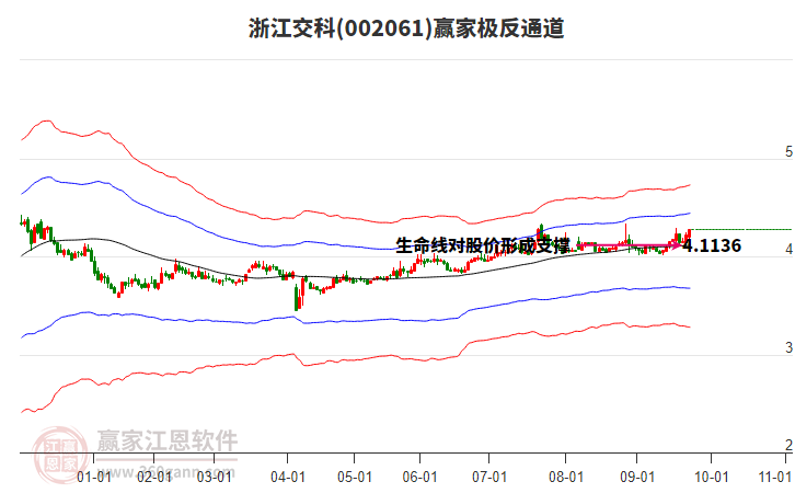 依據(jù)贏家江恩系統(tǒng)趨勢工具極反通道分析判斷浙江交科002061運(yùn)行在生命線以下弱勢區(qū)域,根據(jù)規(guī)則該股短線輕倉參與,股價(jià)跌至弱勢外軌線后波段再結(jié)合其它工具信號建倉。應(yīng)用口訣是:生命線上強(qiáng)勢走,生命線下難抬頭;紅黃兩條外軌線,壓力支撐顯勢頭。