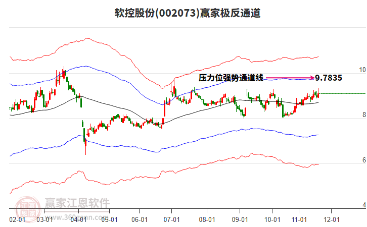 依據(jù)贏家江恩系統(tǒng)趨勢工具極反通道分析判斷軟控股份002073運行在生命線以上強勢區(qū)域,根據(jù)規(guī)則該股可短線、波段結(jié)合操作;結(jié)合物極必反的原理通過分鐘圖做盤中差價,應用口訣是:生命線上強勢走,生命線下難抬頭;紅黃兩條外軌線,壓力支撐顯勢頭。