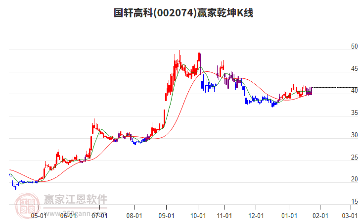 國軒高科(002074)處于贏家江恩多頭中期回調(diào)形態(tài),從1月26日形成頂分型后持續(xù)下跌,重心下移,今日跌破前低形成短期初次筑頂信號,短期多頭趨勢已被破壞,中長線均在空頭下跌趨勢中。國軒高科(00207