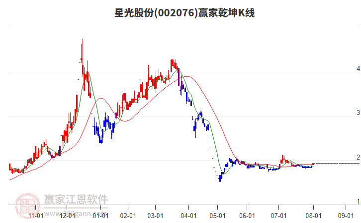 002076*ST星光處于贏家江恩多頭中期回調(diào)形態(tài),今日雖重心上移,但短期空頭趨勢(shì)未改變,7月2日發(fā)出中期江恩筑底信號(hào)后,經(jīng)過(guò)216日,今日形成中期筑頂信號(hào),若持續(xù)下跌,觸發(fā)長(zhǎng)期筑頂信號(hào),002076