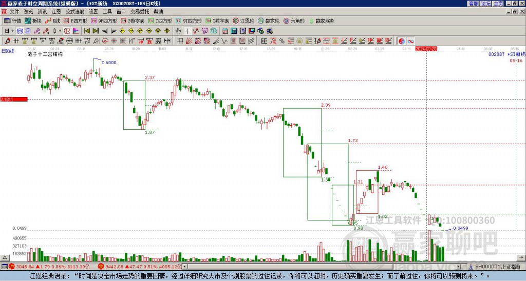 依據(jù)贏家江恩系統(tǒng)趨勢工具極反通道分析判斷*ST新紡002087運(yùn)行在生命線以下弱勢區(qū)域,根據(jù)規(guī)則該股短線輕倉參與,股價(jià)跌至弱勢外軌線后波段再結(jié)合其它工具信號(hào)建倉。應(yīng)用口訣是:生命線上強(qiáng)勢走,生命線下難抬頭;紅黃兩條外軌線,壓力支撐顯勢頭。