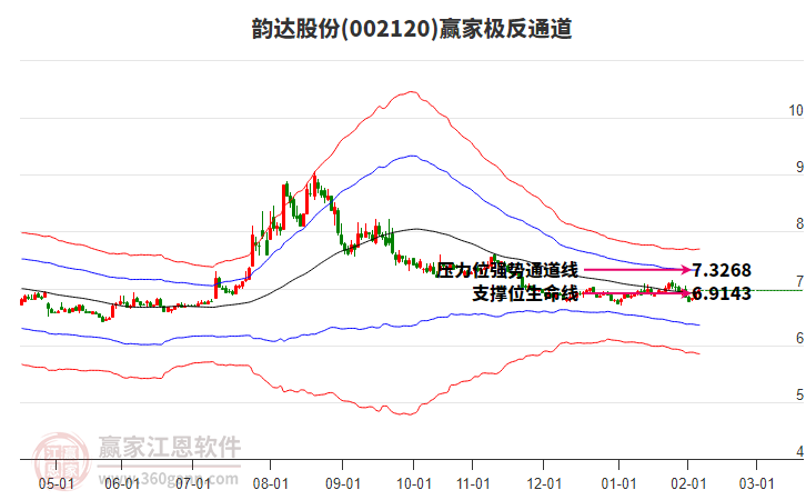 韻達(dá)股份處于贏家江恩空頭主線形態(tài),從1月26日形成頂分型后持續(xù)下跌,今日形成短期初次筑頂信號,短期多頭趨勢已被破壞,中期多頭反彈趨勢延續(xù),但長期處于下跌中。韻達(dá)股份根據(jù)贏家江恩極反通道趨勢工具展示,上