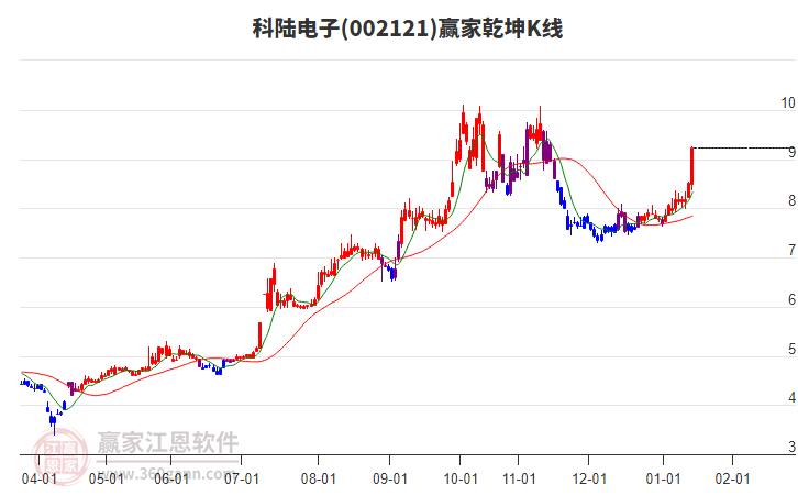 002121科陸電子低開收陽線,上穿江恩價(jià)格百分比工具關(guān)鍵點(diǎn)位9.11元