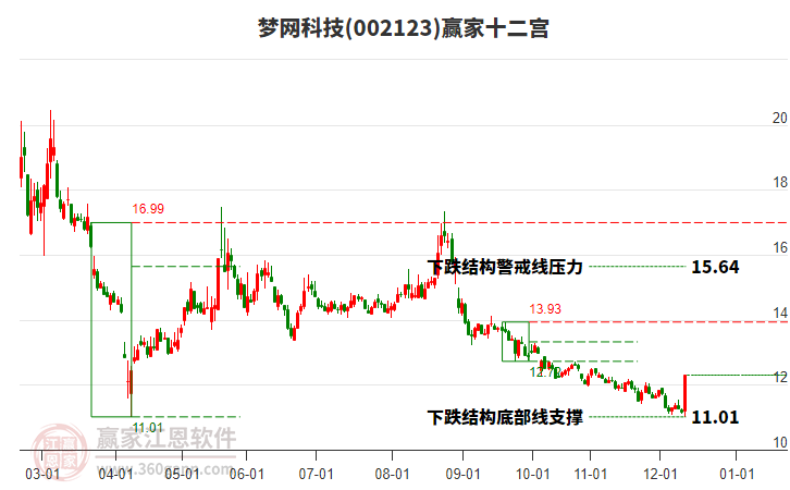002123夢(mèng)網(wǎng)科技根據(jù)贏家江恩極反通道趨勢(shì)工具展示,上方壓力位12.451,下方支撐位9.931。002123夢(mèng)網(wǎng)科技處于贏家江恩多頭中期回調(diào)形態(tài),從1月13日形成頂分型后持續(xù)下跌,重心下移,今日跌
