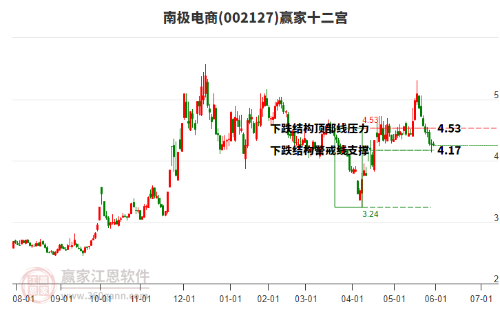 002127南極電商根據(jù)贏家江恩極反通道趨勢(shì)工具展示,上方壓力位3.8815,下方支撐位3.4979。002127南極電商處于贏家江恩空頭中期反彈形態(tài),今日重心上移,短期持續(xù)上漲,形成筑底信號(hào),從1月