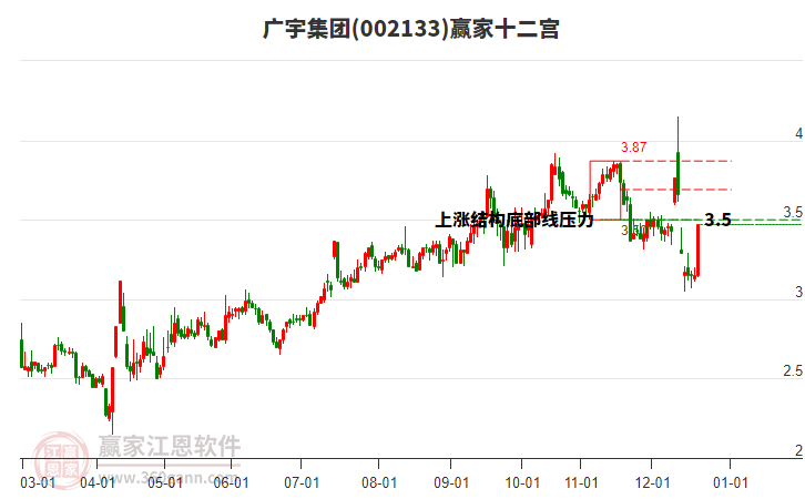 002133廣宇集團(tuán)根據(jù)贏家江恩極反通道趨勢(shì)工具展示,上方壓力位3.5055,下方支撐位2.7902。002133廣宇集團(tuán)處于贏家江恩多頭中期回調(diào)形態(tài),12月12日發(fā)出江恩筑頂信號(hào)后,經(jīng)過(guò)26日,今日
