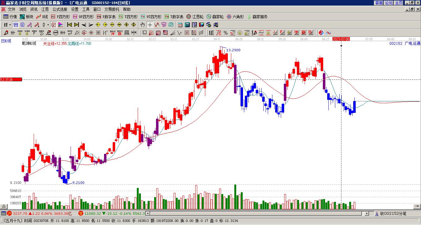 今天002152廣電運通以光腳上影中陽線收盤,今天是關(guān)鍵時間窗口
