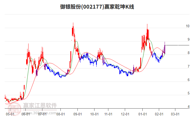 御銀股份002177形成多頭吞噬組合形態(tài),處于強勢通道延續(xù)上漲趨勢