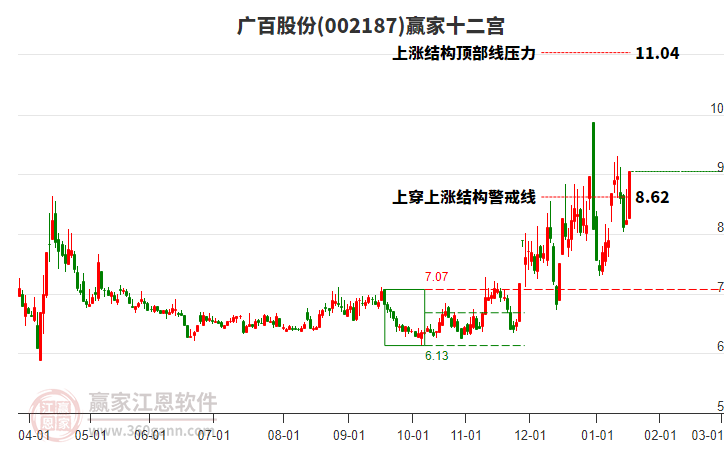 002187廣百股份目前漲停,所屬板塊預(yù)制菜發(fā)出多頭預(yù)警信號。002187廣百股份根據(jù)贏家江恩極反通道趨勢工具展示,上方壓力位9.9816,下方支撐位7.69。002187廣百股份處于贏家江恩多頭主線