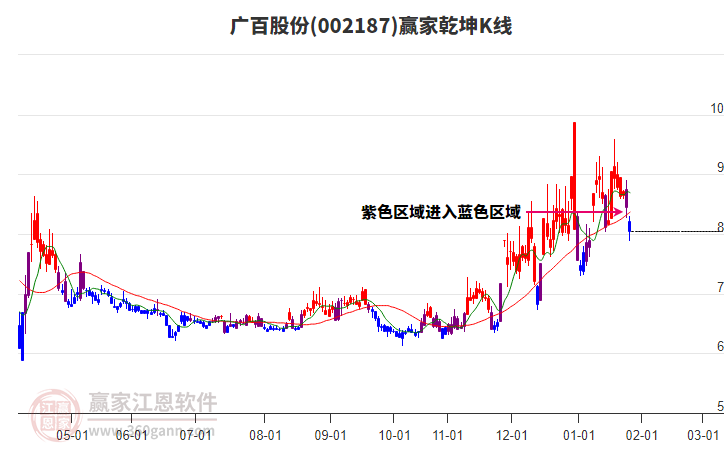 今天002187廣百股份漲停,贏家江恩費氏時間周期線顯示今天是時間窗