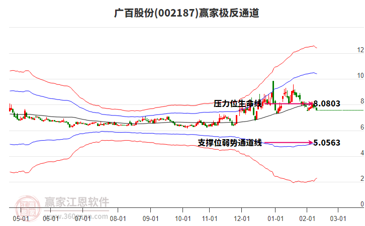 依據(jù)贏家江恩系統(tǒng)趨勢工具極反通道分析判斷廣百股份002187運行在生命線以上強勢區(qū)域,根據(jù)規(guī)則該股可短線、波段結(jié)合操作;結(jié)合物極必反的原理通過分鐘圖做盤中差價,應(yīng)用口訣是:生命線上強勢走,生命線下難抬頭;紅黃兩條外軌線,壓力支撐顯勢頭。