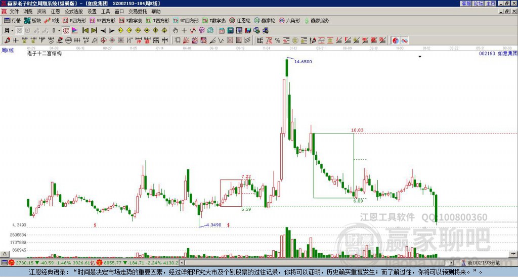 如意集團(tuán)(002193)低開收光腳上影中陽線,等距時間周期線顯示近期時間窗2月9日