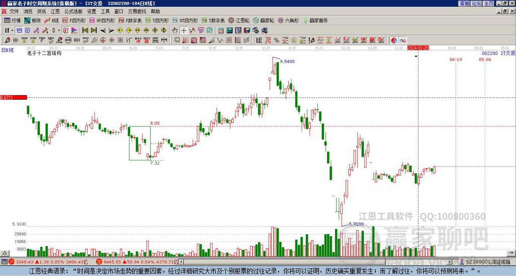 依據(jù)贏家江恩系統(tǒng)趨勢工具極反通道分析判斷ST交投002200運行在生命線以下弱勢區(qū)域,根據(jù)規(guī)則該股短線輕倉參與,股價跌至弱勢外軌線后波段再結合其它工具信號建倉。應用口訣是:生命線上強勢走,生命線下難抬頭;紅黃兩條外軌線,壓力支撐顯勢頭。
