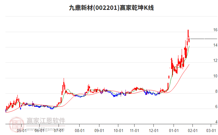 002201九鼎新材自1月22日漲停,快速拉升2個(gè)交易日后,今日再次漲停,近期低點(diǎn)1月8日上漲至1月26日,共12日漲幅54.9%。近一年以來已漲停了16次,中間出現(xiàn)連板時(shí)間段有3次,最近一次連板發(fā)生