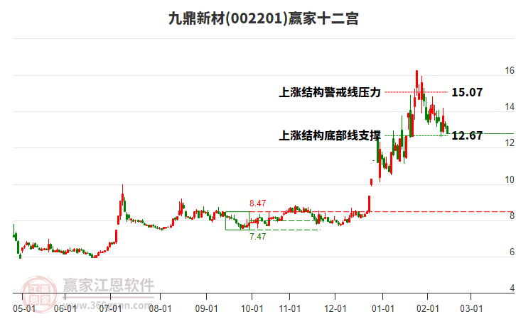 2月13日股價(jià)處在2022年6月14日形成的上漲結(jié)構(gòu)底部線與警戒線之間,今日股價(jià)小幅下跌3.03%,目前處于底部線上方。依據(jù)贏家十二宮多空能量守恒規(guī)則,上漲結(jié)構(gòu)底部線位置是多空能量轉(zhuǎn)換的一個(gè)關(guān)鍵位置。如底部線12.67支撐不破,由多方能量主導(dǎo)上攻,在警戒線15.07尋找多空能量平衡。如跌破底部線,空方動(dòng)能占據(jù)主導(dǎo),打開新的下跌空間。