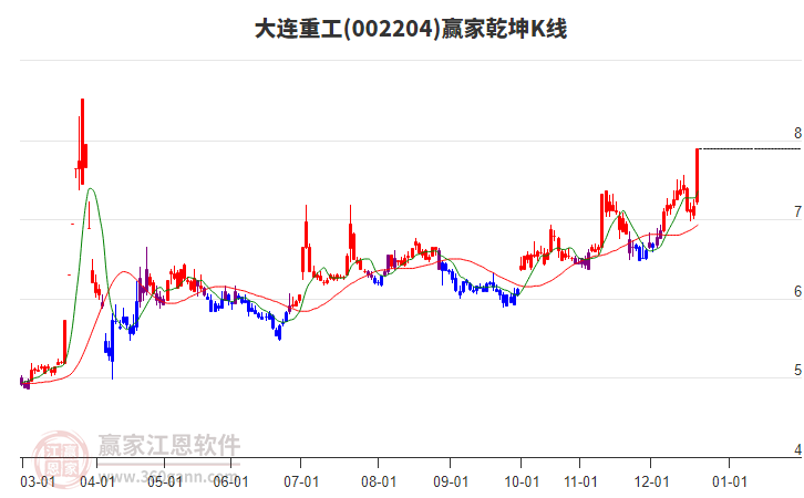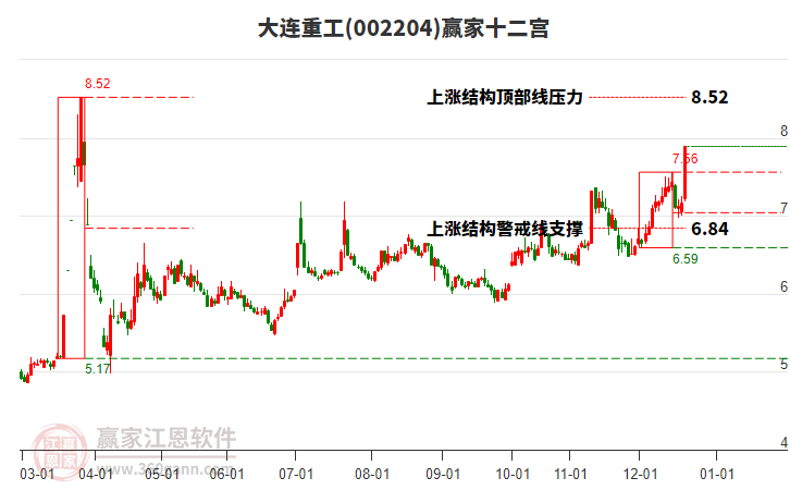 002204大連重工根據(jù)贏家江恩極反通道趨勢工具展示,上方壓力位8.3707,下方支撐位7.2482。002204大連重工處于贏家江恩多頭主線形態(tài),1月14日發(fā)出江恩筑頂信號后,經(jīng)過6日,今日再次發(fā)出