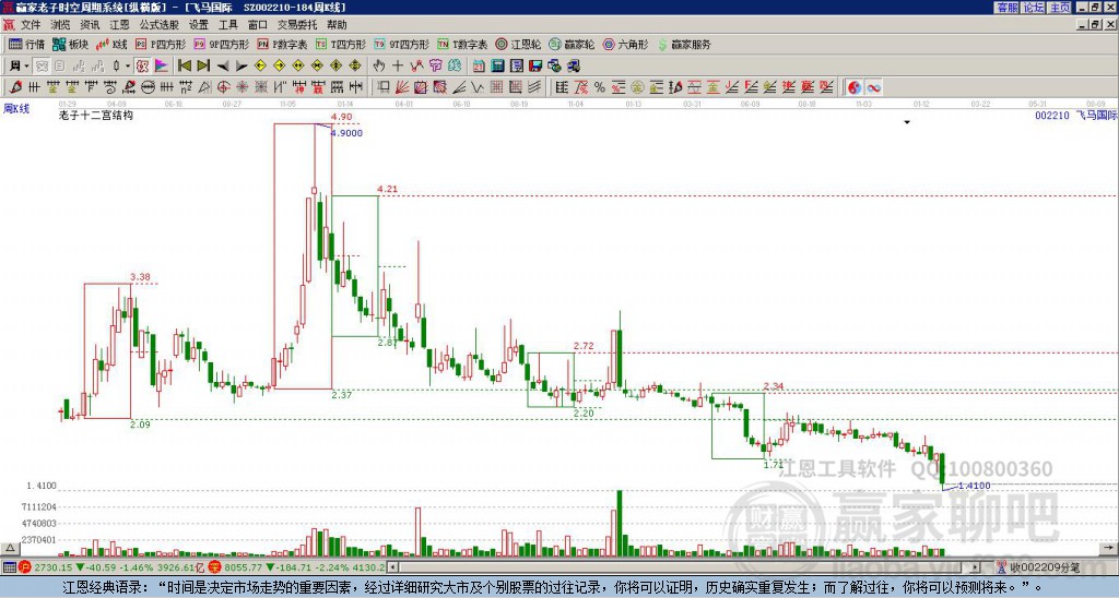 002210飛馬國(guó)際處于贏家江恩多頭中期回調(diào)形態(tài),從12月29日形成頂分型后持續(xù)下跌,重心下移,今日跌破前低形成短期初次筑頂信號(hào),短期多頭趨勢(shì)已被破壞,中長(zhǎng)線均在空頭下跌趨勢(shì)中。002210飛馬國(guó)際根