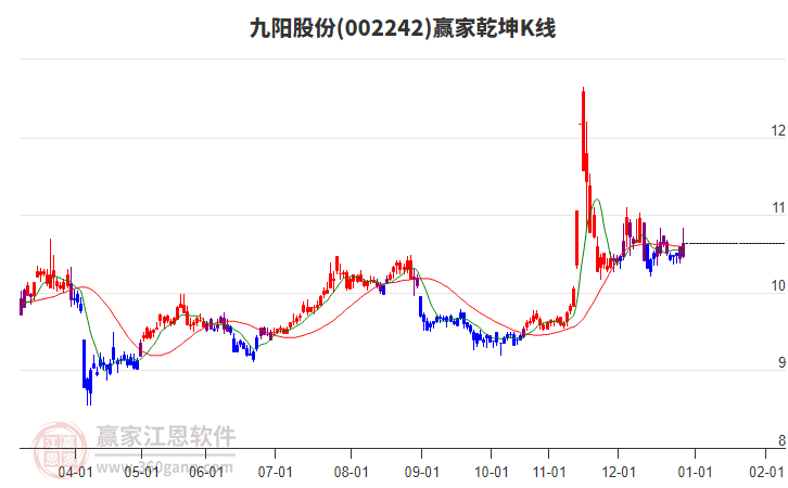 002242九陽(yáng)股份根據(jù)贏家江恩極反通道趨勢(shì)工具展示,上方壓力位11.7892,下方支撐位10.4783。002242九陽(yáng)股份處于贏家江恩多頭主線形態(tài),12月30日發(fā)出江恩筑頂信號(hào)后,經(jīng)過10日,今日