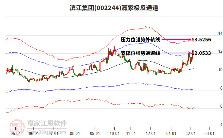 周一濱江集團(tuán)最高價(jià)12.3上穿了贏家極反通道工具藍(lán)色外軌線,受到藍(lán)色外軌線強(qiáng)力壓制,最終收盤停留在在藍(lán)色外軌線與生命線上方的強(qiáng)勢(shì)通道區(qū)域。濱江集團(tuán)近10個(gè)交易日漲幅12.87%。