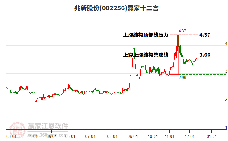2月13日股價處在2025年11月14日形成的上漲結(jié)構(gòu)底部線與警戒線之間,今日股價小幅下跌2.22%,目前處于底部線上方。依據(jù)贏家十二宮多空能量守恒規(guī)則,上漲結(jié)構(gòu)底部線位置是多空能量轉(zhuǎn)換的一個關(guān)鍵位置。如底部線2.96支撐不破,由多方能量主導(dǎo)上攻,在警戒線3.66尋找多空能量平衡。如跌破底部線,空方動能占據(jù)主導(dǎo),打開新的下跌空間。