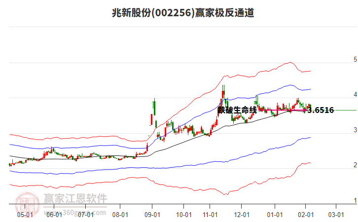 依據(jù)贏家江恩系統(tǒng)趨勢工具極反通道分析判斷兆新股份002256運行在生命線以下弱勢區(qū)域,根據(jù)規(guī)則該股短線輕倉參與,股價跌至弱勢外軌線后波段再結(jié)合其它工具信號建倉。應(yīng)用口訣是:生命線上強勢走,生命線下難抬頭;紅黃兩條外軌線,壓力支撐顯勢頭。
