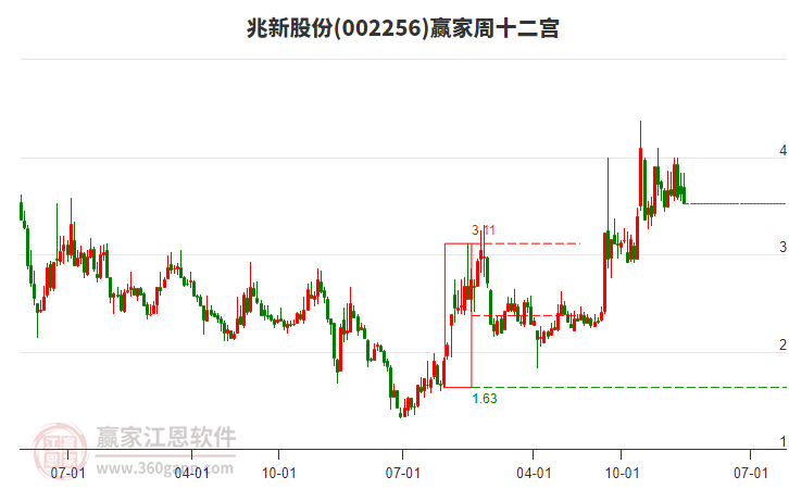 依據(jù)贏家江恩輪中輪價(jià)格模型工具展示,本周以陰線收盤,自近期高點(diǎn)4.37跌至本周,下跌了0.84點(diǎn),受贏家江恩輪中輪三角形3.1點(diǎn)支撐。依據(jù)贏家江恩輪中輪規(guī)則,市場(chǎng)中三分位、四分位是一切市場(chǎng)周期運(yùn)行的基礎(chǔ)。若股價(jià)繼續(xù)站穩(wěn)三角形關(guān)鍵位置,則有望反彈至上方四方形3.99位置。若繼續(xù)向下跌破三角形關(guān)鍵位置,將注意下方四方形支撐位2.65。