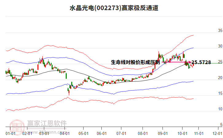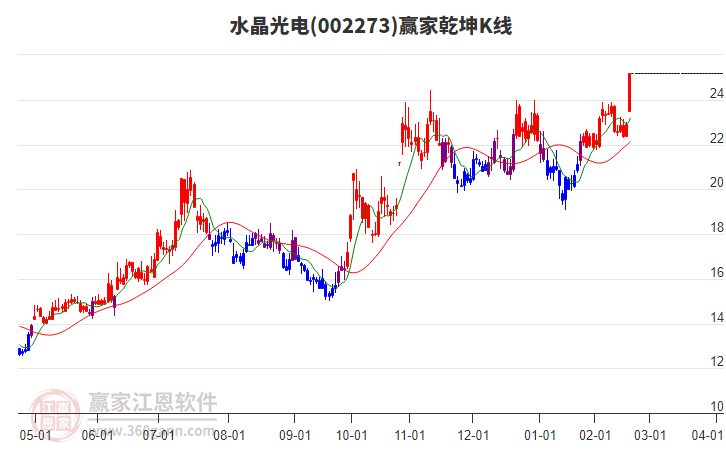水晶光電002273低開收穿頭破腳大陽線,上穿黃金價(jià)格延伸線工具關(guān)鍵點(diǎn)位26.75元