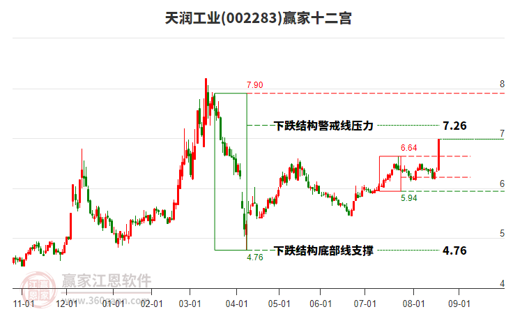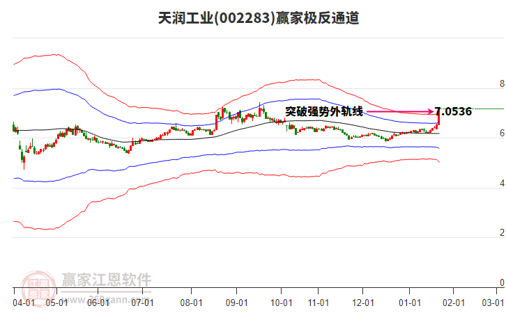 目前天潤工業(yè)最高價7.5挑戰(zhàn)了贏家極反通道工具上方紅色外軌線,受到上方紅色外軌線強力壓制,最終收盤停留在在上方紅色外軌線與藍色外軌線上方的超強通道區(qū)域。天潤工業(yè)近10個交易日漲幅17.46%。