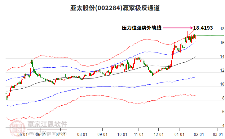 1月15日002284亞太股份最高價(jià)17.93挑戰(zhàn)了贏家極反通道工具上方紅色外軌線,受到上方紅色外軌線強(qiáng)力壓制,最終收盤(pán)停留在在上方紅色外軌線與藍(lán)色外軌線上方的超強(qiáng)通道區(qū)域。002284亞太股份近10