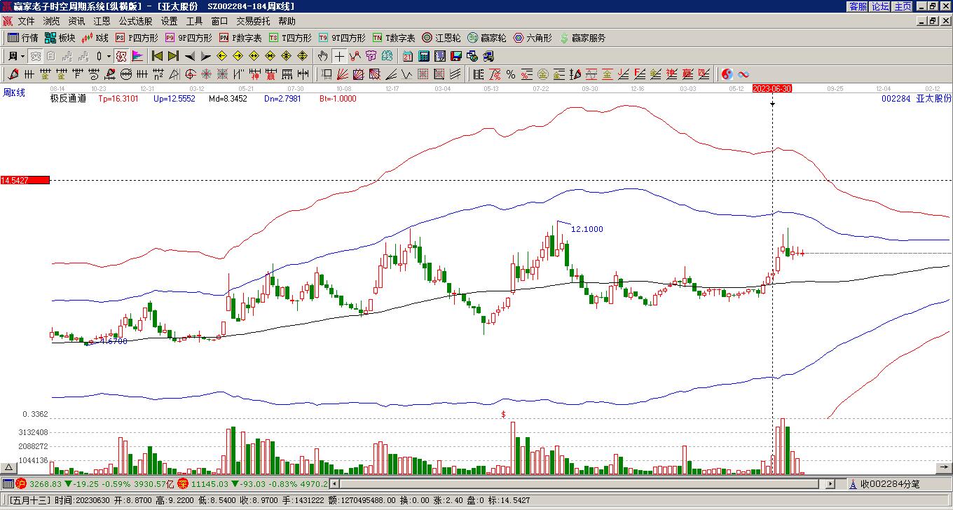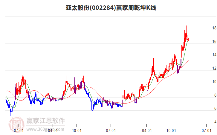 1月15日002284亞太股份最高價17.93挑戰(zhàn)了贏家極反通道工具上方紅色外軌線,受到上方紅色外軌線強(qiáng)力壓制,最終收盤停留在在上方紅色外軌線與藍(lán)色外軌線上方的超強(qiáng)通道區(qū)域。002284亞太股份近10