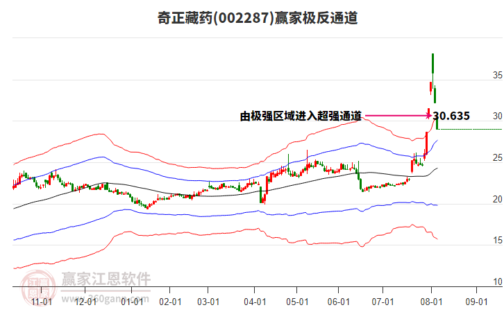 依據(jù)贏家江恩系統(tǒng)趨勢工具極反通道分析判斷奇正藏藥002287運行在生命線以下弱勢區(qū)域,根據(jù)規(guī)則該股短線輕倉參與,股價跌至弱勢外軌線后波段再結(jié)合其它工具信號建倉。應(yīng)用口訣是:生命線上強勢走,生命線下難抬頭;紅黃兩條外軌線,壓力支撐顯勢頭。