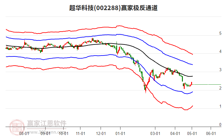 依據(jù)贏家江恩系統(tǒng)趨勢工具極反通道分析判斷*ST超華002288運(yùn)行在生命線以下弱勢區(qū)域,根據(jù)規(guī)則該股短線輕倉參與,股價跌至弱勢外軌線后波段再結(jié)合其它工具信號建倉。應(yīng)用口訣是:生命線上強(qiáng)勢走,生命線下難抬頭;紅黃兩條外軌線,壓力支撐顯勢頭。