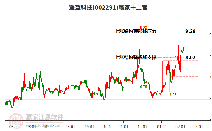 2月13日股價跌破上漲結(jié)構(gòu)頂部線位置,股價自前方高點2月5日9.04持續(xù)下跌6日跌幅17.25%,依據(jù)贏家十二宮結(jié)構(gòu)規(guī)則,股價突破上漲結(jié)構(gòu)頂部線后再次跌破頂部線,多空能量再次在頂部線尋找平衡。若確認跌破頂部線,出現(xiàn)空方能量守恒狀態(tài),向下警戒線尋找多空能量平衡位。
