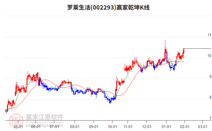 002293羅萊生活上漲遇阻 受藍(lán)色外軌線壓制 以光腳上影中陽(yáng)線收盤